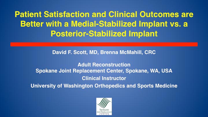 Dr. Scott’s presentation, titled “Patient Satisfaction and Clinical Outcomes Are Better With a Medial-Stabilized Implant vs. a Posterior-Stabilized Implant,” compared the clinical results after total knee replacement with two different implants to determine whether one implant provided better results.