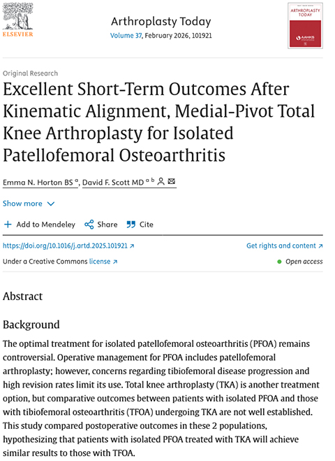 Excellent Short-Term Outcomes After Kinematic Alignment, Medial-Pivot Total Knee Arthroplasty for Isolated Patellofemoral OsteoarthritisDavid F. Scott, MD, Arthroplasty Today