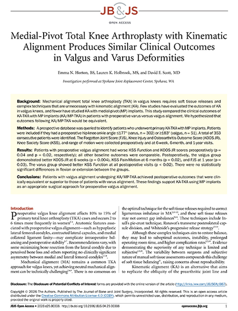 Medial-Pivot Total Knee Arthroplasty with Kinematic Alignment Produces Similar Clinical Outcomes in Valgus and Varus DeformitiesDavid F. Scott, MD, JBJS Open Access