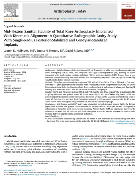 Mid-Flexion Sagittal Stability of Total Knee Arthroplasty Implanted With Kinematic Alignment: A Quantitative Radiographic Laxity Study With Single-Radius Posterior-Stabilized and Condylar-Stabilized ImplantsDavid F. Scott, MD, Arthroplasty Today